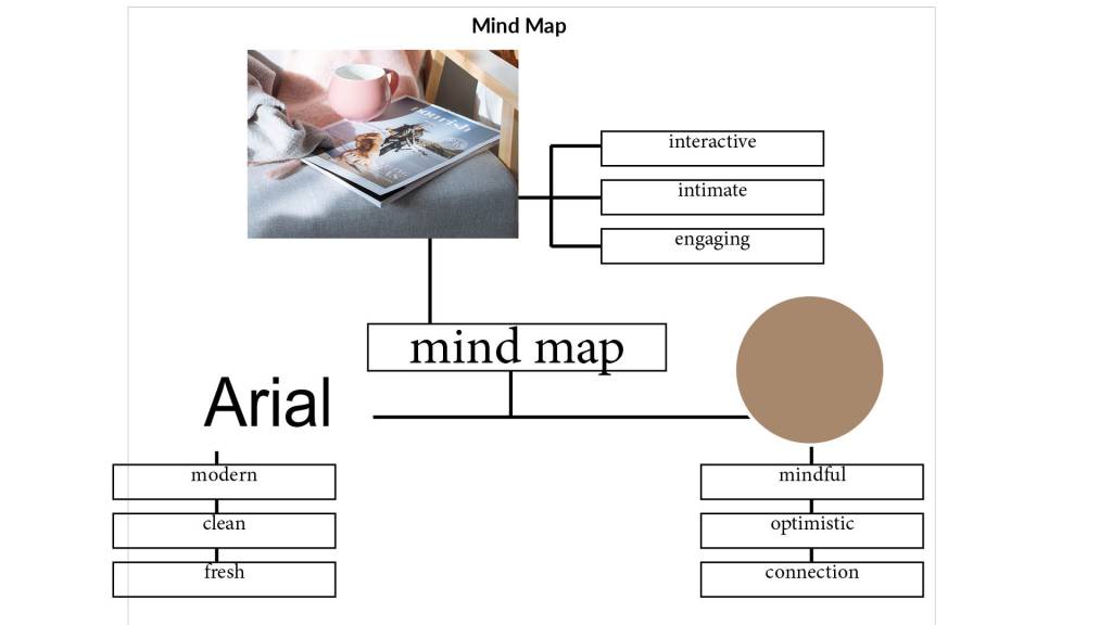 The components in my mind map represent the target audience because it specifically caters to every one of their needs. The font I chose is very modern, clean, and fresh which is everything that a millennial is looking for in a font for an advertisement. The image I chose is very interactive because it shows the mug sitting on the book intimate. It feels like you are sitting down for a cup of coffee with someone. I chose the color beige because it is calming to look at, mindful, optimistic, and shows a connection with each other.